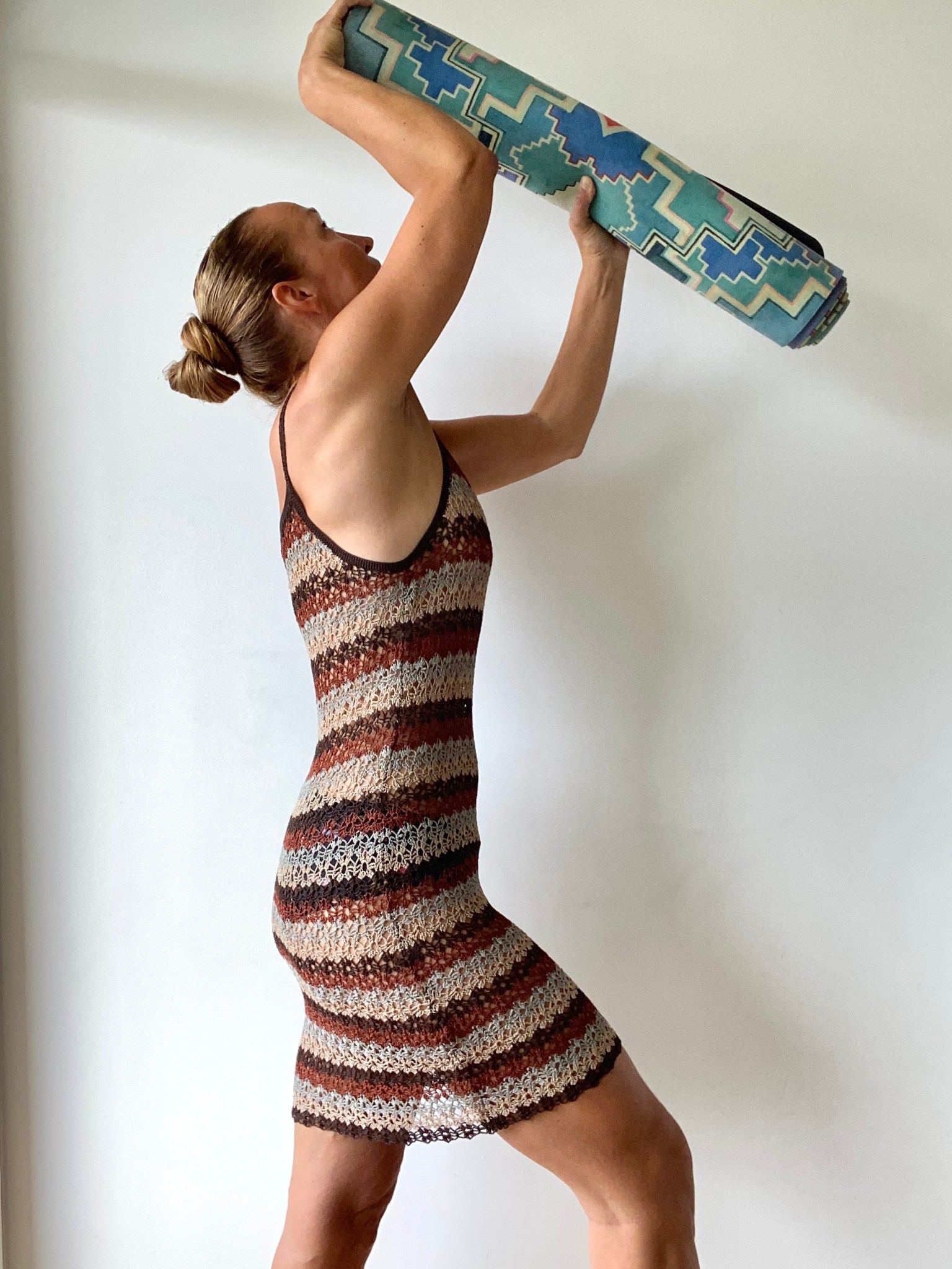 Nogle af malerierne trykker jeg på yogamåtter, som jeg også sælger. Jeg savnede selv en yogamåtte, der ikke bare var kedeligt ensfarvet, men med motiverende farver og mønstre. Jeg har indtil videre lavet tre forskellige og er i gang med den fjerde. På billedet herunder står jeg med min tredje yogamåtte (og min egen favorit, fordi den er særligt velegnet til hot yoga). Mønstret på måtten er mit akrylmaleri ‘Island of the Gods’, inspireret af en meget smuk og saftig yogaferie på Bali. Se meget mere på chriszka.myshopify.com.